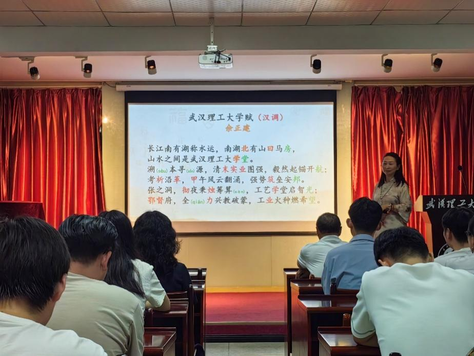 活动特邀湖北智库专家、武汉女子诗社社长薛姣老师现场进行了非物质文化遗产“吟诵”教学,并带领全体人员诵读《武汉理工大学赋》,以传统艺术形式展现学校120余年发展历程中形成的武汉理工精神底蕴。